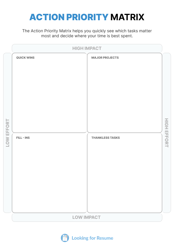 Whether you are a student, job seeker, or working professional, this planner will help you stay productive, prioritize better, and make smarter decisions with your limited time. At Looking For Resume, we’ve designed a free Action Priority Matrix template (PDF + Printable) that you can download and start using right away.