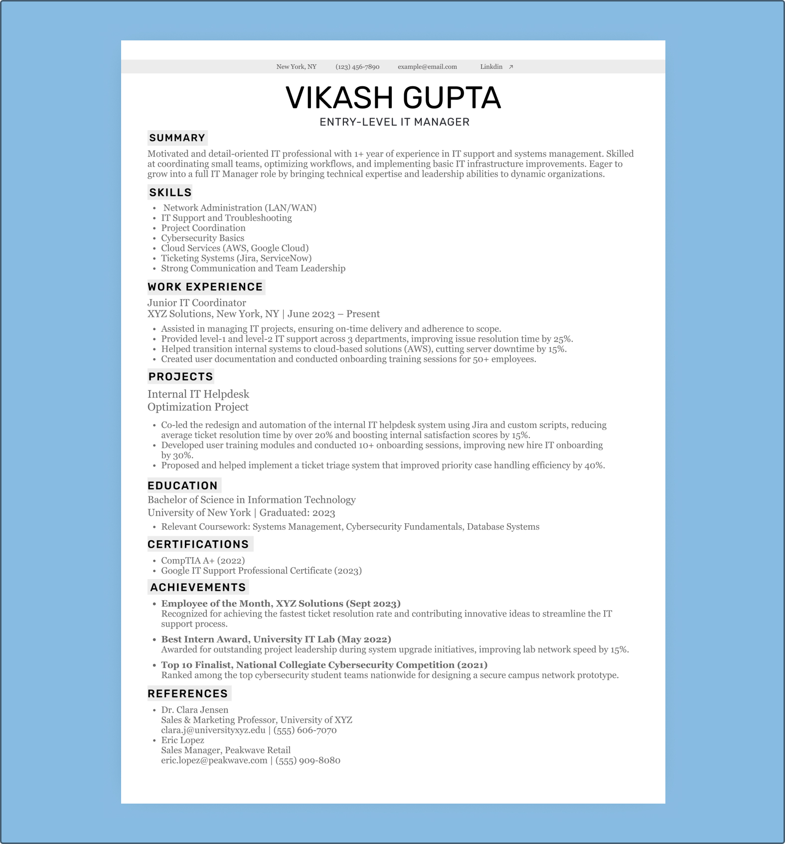 This resume highlights essential IT skills like networking, troubleshooting, AWS, Jira, and cybersecurity, while keeping the layout simple and recruiter-friendly. The perfect first step to land your first full-time IT job in 2025!
