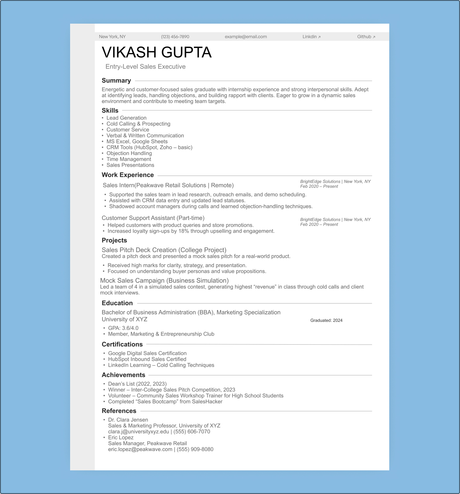 This resume template will help you make an excellent first impression if you are just getting started and wish to impress. This format will highlight your college projects, internships and skills in a professional manner.