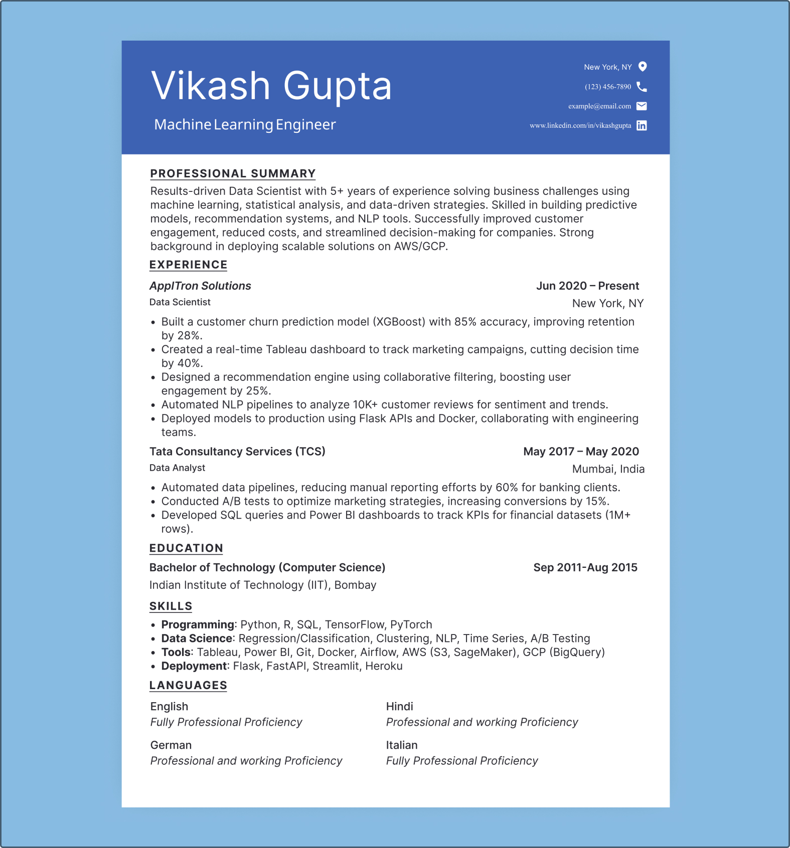 This template is designed for professionals who have 3-7 years’ experience in data science or AI. It helps to highlight the strengths of your tools, techniques and impact on real life. This resume format is perfect for applying to cloud-based companies that use ML, AI startups or tech giants. It keeps your application focused and clean.