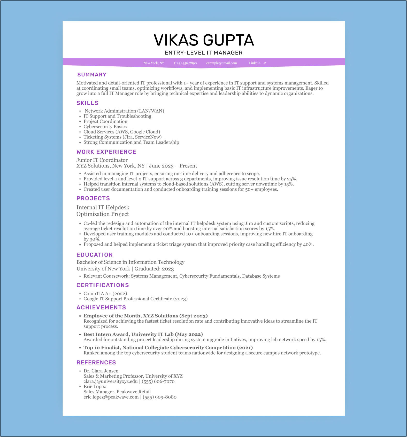The resume template is accessible in the PDF format for free and you can modify it without difficulty. Whether you are looking for your first IT job or your next opportunity, this resume template will help you stand out.