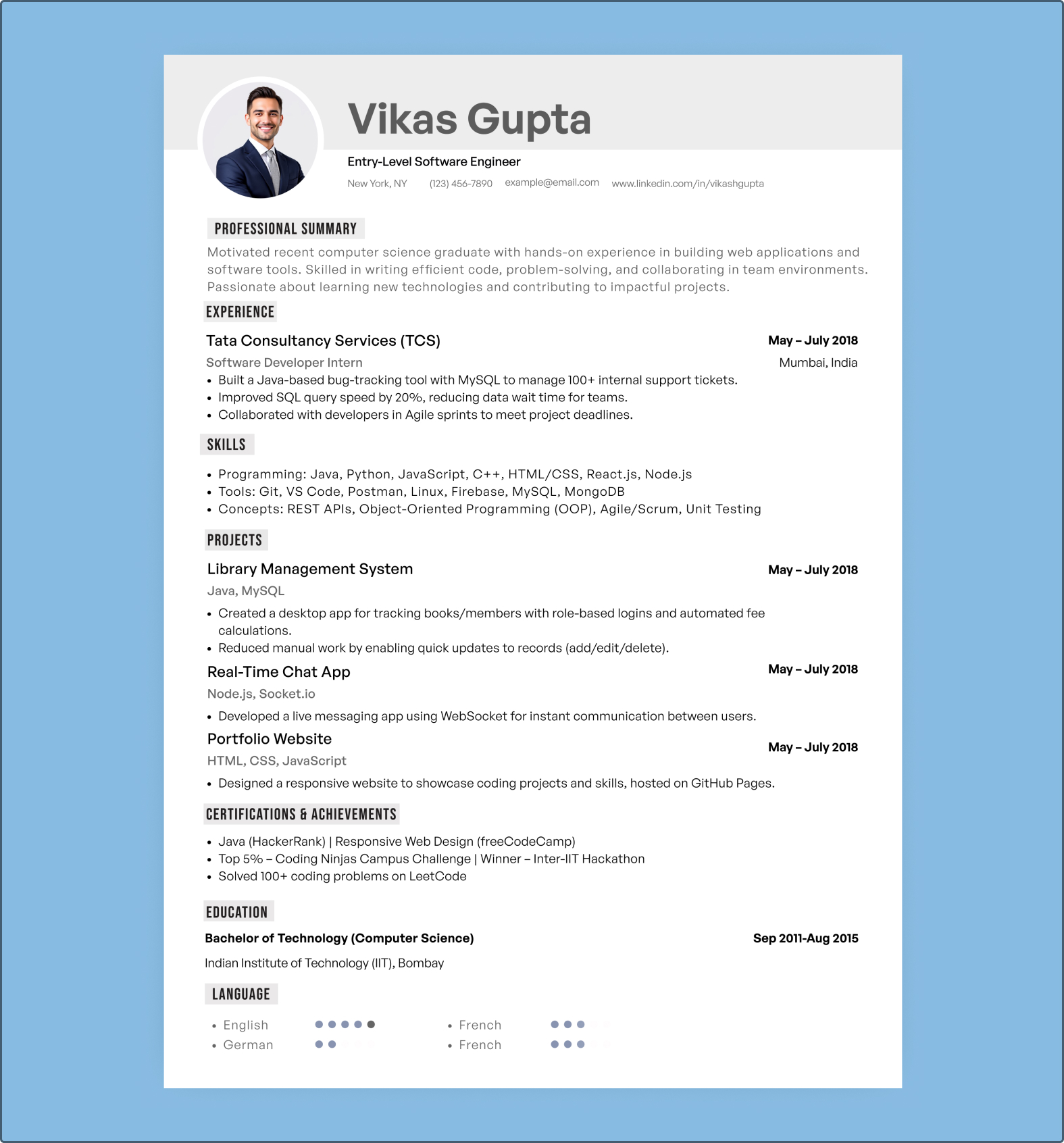 Its strength lies in its clean and organized design. Recruiters are able to quickly browse through important areas without missing crucial information. Through displaying skills, projects and certificates with a clear layout that highlights your abilities even if you do not have many years of experience in the field. This is a good selection for those looking for job opportunities, internships, or academic opportunities.